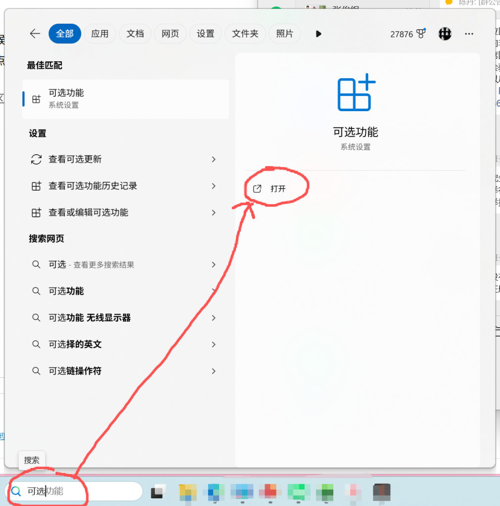 处理实验数据的时候想到,要是能够把另一个电脑当作显示屏就好了。实际上Window本身就带有这个功能。为了做到这一点,你需要在你希望用来当作扩展显示屏的电脑中,在下边栏搜索“可选功能”:
