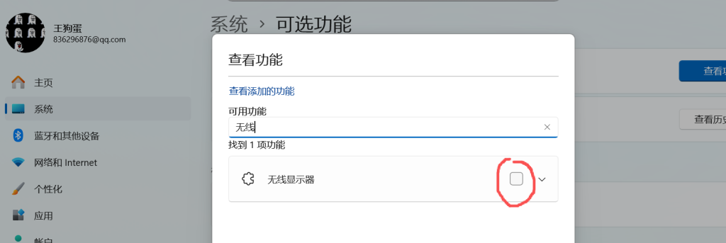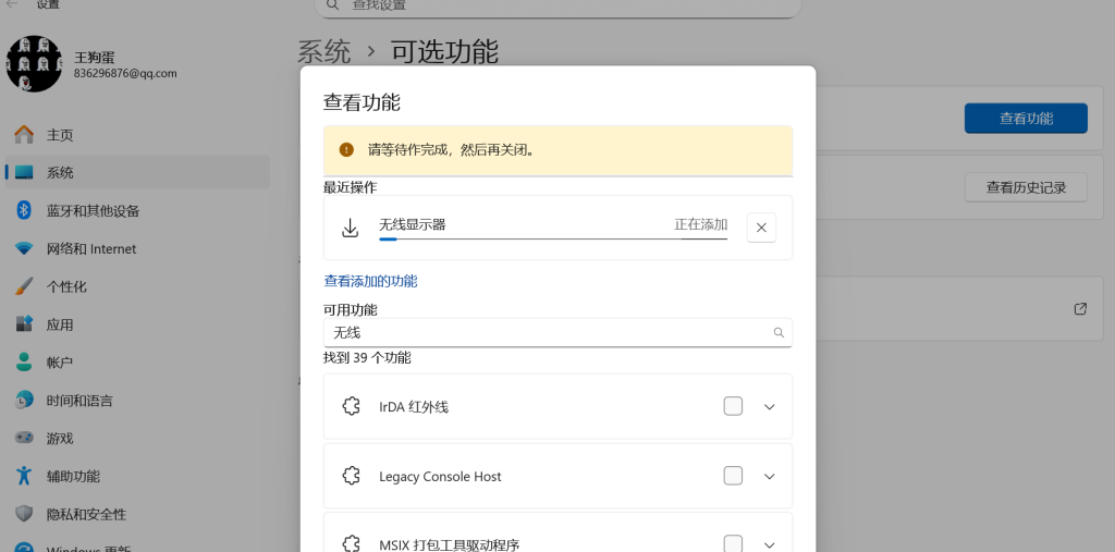 然后点击“查看可用功能”,搜索“无线显示器”,勾选,然后点击左下角的添加