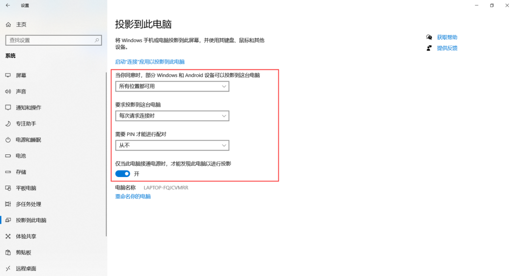安装成功以后,在“系统”里会多出“投影到此电脑”这一栏(你也可以通过搜索栏直接找到它),在里面设置如下图,然后点击“启动连接应用以投影到此电脑”: