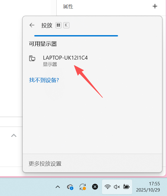 这时候,在另一台电脑(作为控制端)上,按下win+K,就能看到这台需要作为扩展显示屏的电脑(你必须保证这两台电脑在同一个局域网下,例如连接同一个wifi):