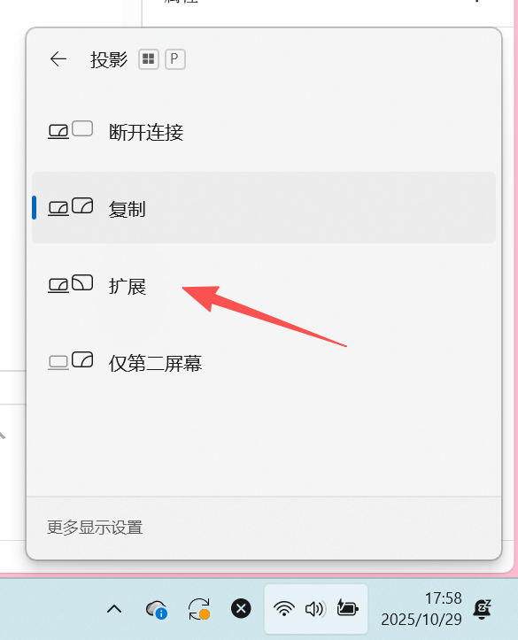 点击它,就能成功连接了。现在这台电脑显示地和另一台电脑一样,也就是复制了另一台电脑的显示内容。如果想让这台电脑作为扩展屏,那么在另一台电脑(控制端)按下win+P,选择“扩展”模式就好了: